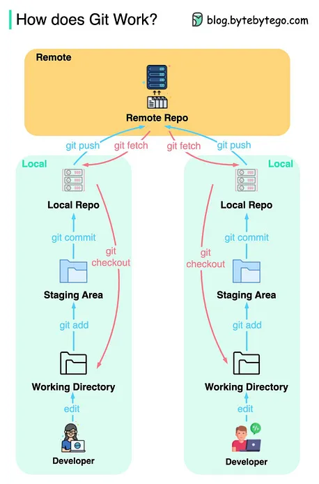 - Staging Area: 커밋을 준비하는 영역. 워킹 디렉토리에서 변경된 파일 중 커밋하고 싶은 내용을 선택해 추가할 수 있다.(커밋 선별 공간)