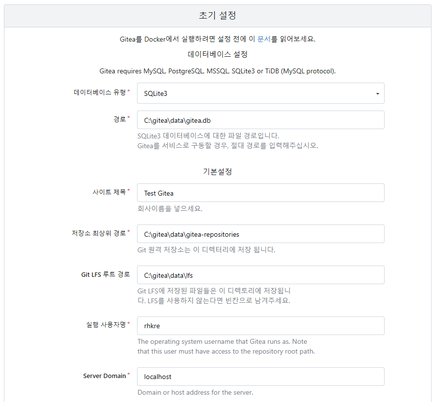 Gitea에서 제공하는 문서에서 항목들을 보고 필요한 것들만 설정하면 된다.