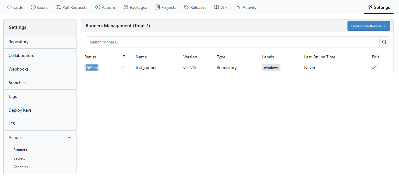 *토큰은 Gitea ui에서 확인이 가능하다. Repository - Settings - Actions(Runners) 에서 Create new Runner를 누르면 등록용 토큰을 볼 수 있다.