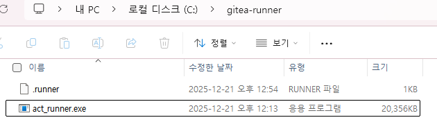 runner는 따로 설치를 해줘야 한다. https://dl.gitea.com/act_runner/ 에서 원하는 버전을 선택해 운영체제에 맞게 다운로드 할 수 있으며 Gitea와 마찬가지로 단일 실행파일로 구성되어 있다.