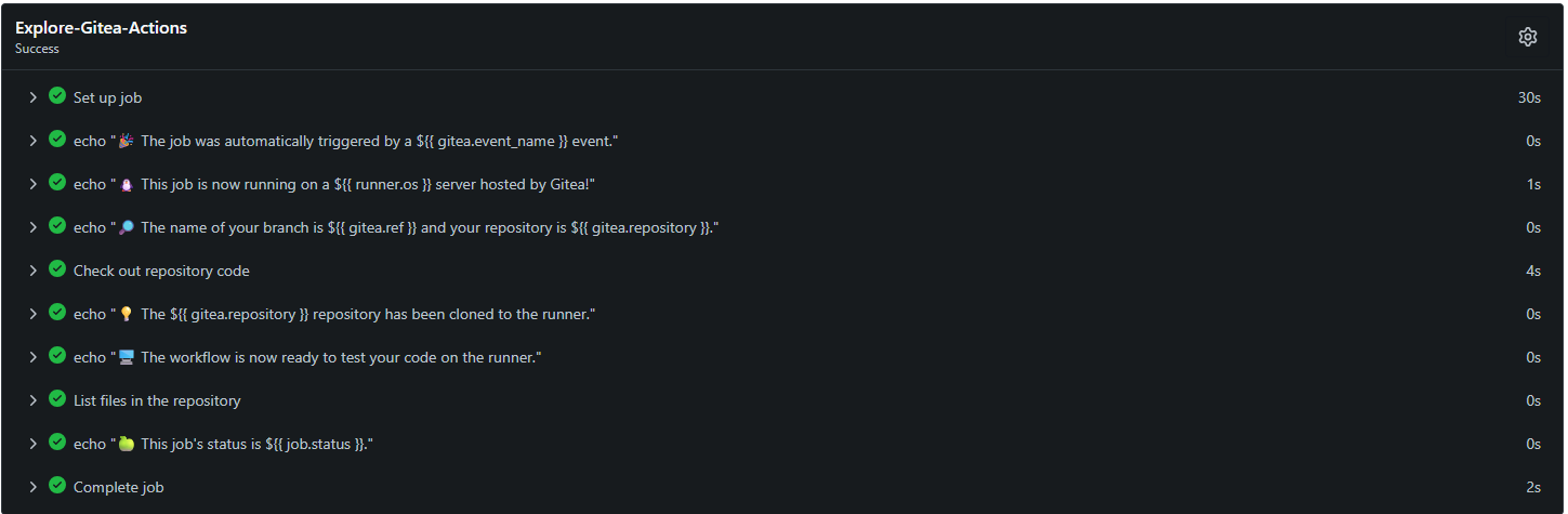 이후 등록된 레포지토리에서 push를 하게 되면 위 steps과정이 진행되면서 act_runner 설정까지 완료할 수 있다.