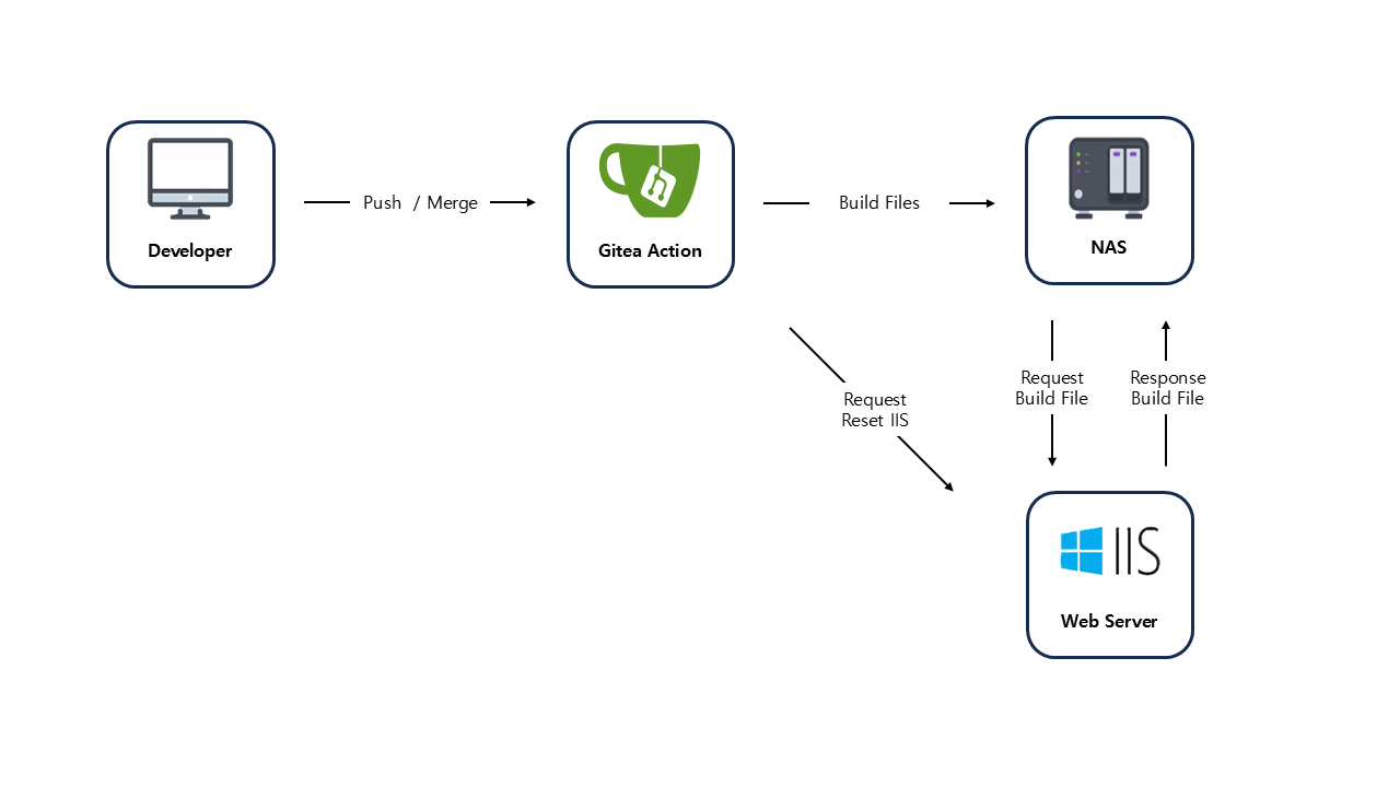 개발자가 코드를 푸쉬 혹은 머지하고 Gitea의 web hook과 runner를 사용해 빌드를 하고 산출물을 배포하는 과정을 만들었다. 서버 리소스가 한정적이기 때문에 Gitea서버 내에서 빌드를 진행했다.