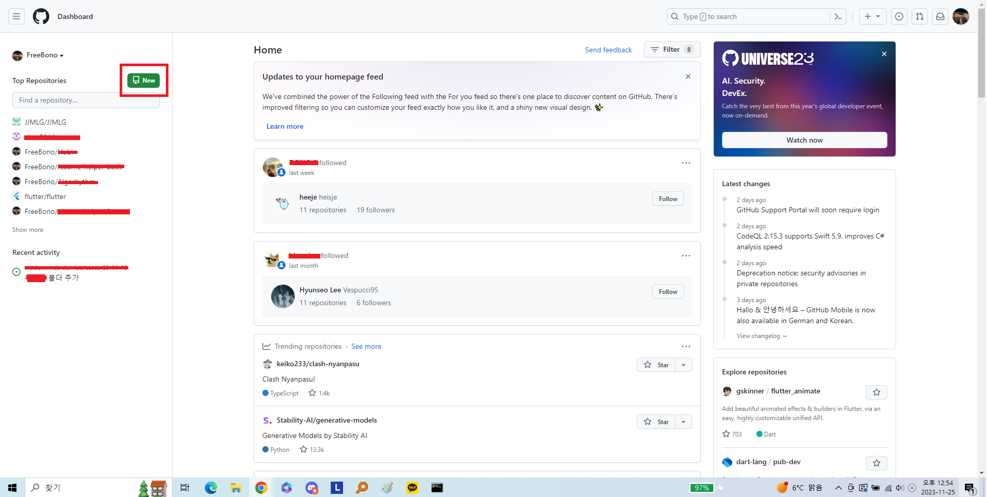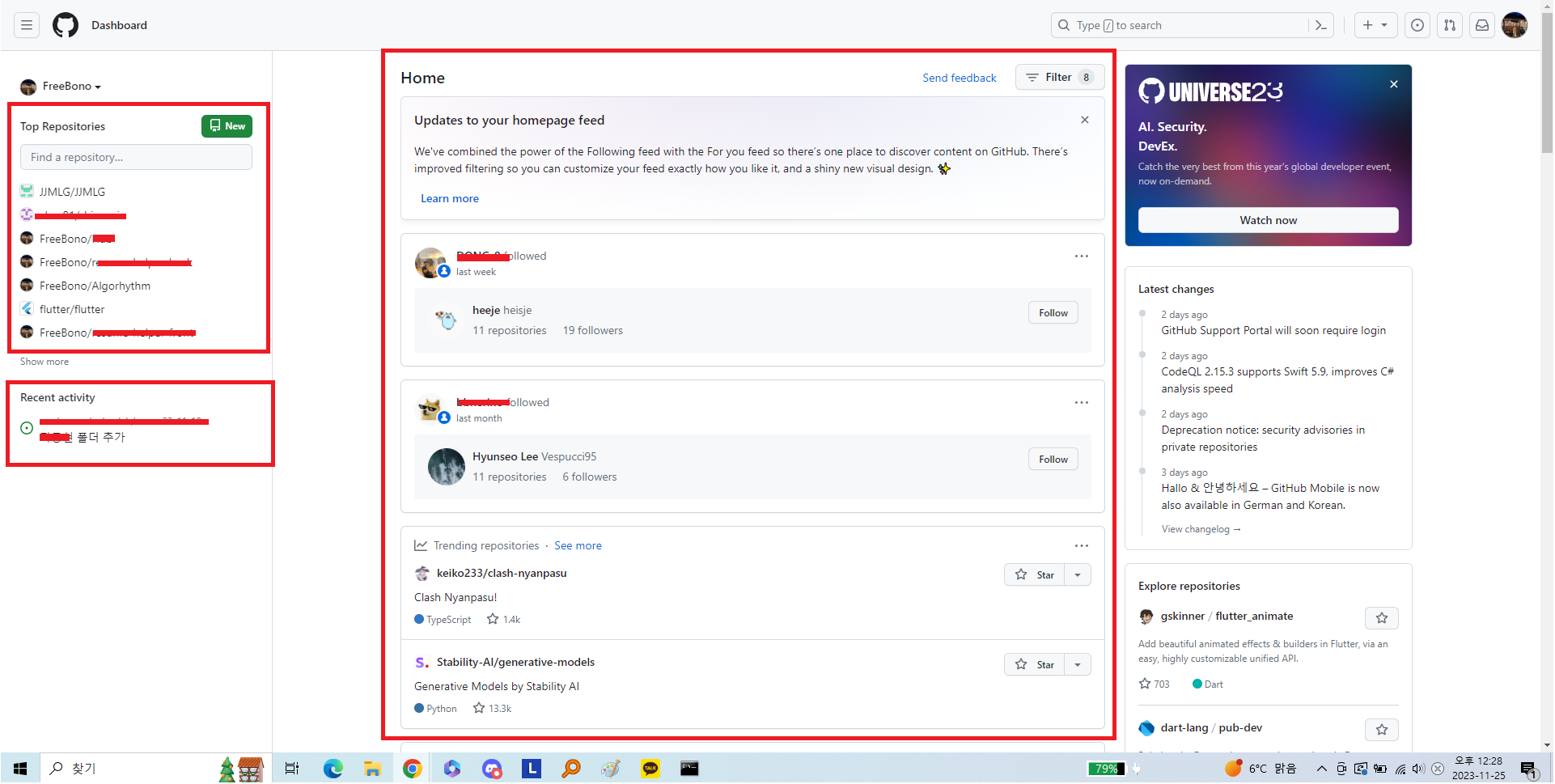 좌측에는 내가 가진 레포지토리(Remote Repository), 관련 활동(Issue)의 내용이 있고, 중앙에는 내가 팔로우 한 사람들의 다양한 활동이 보인다.