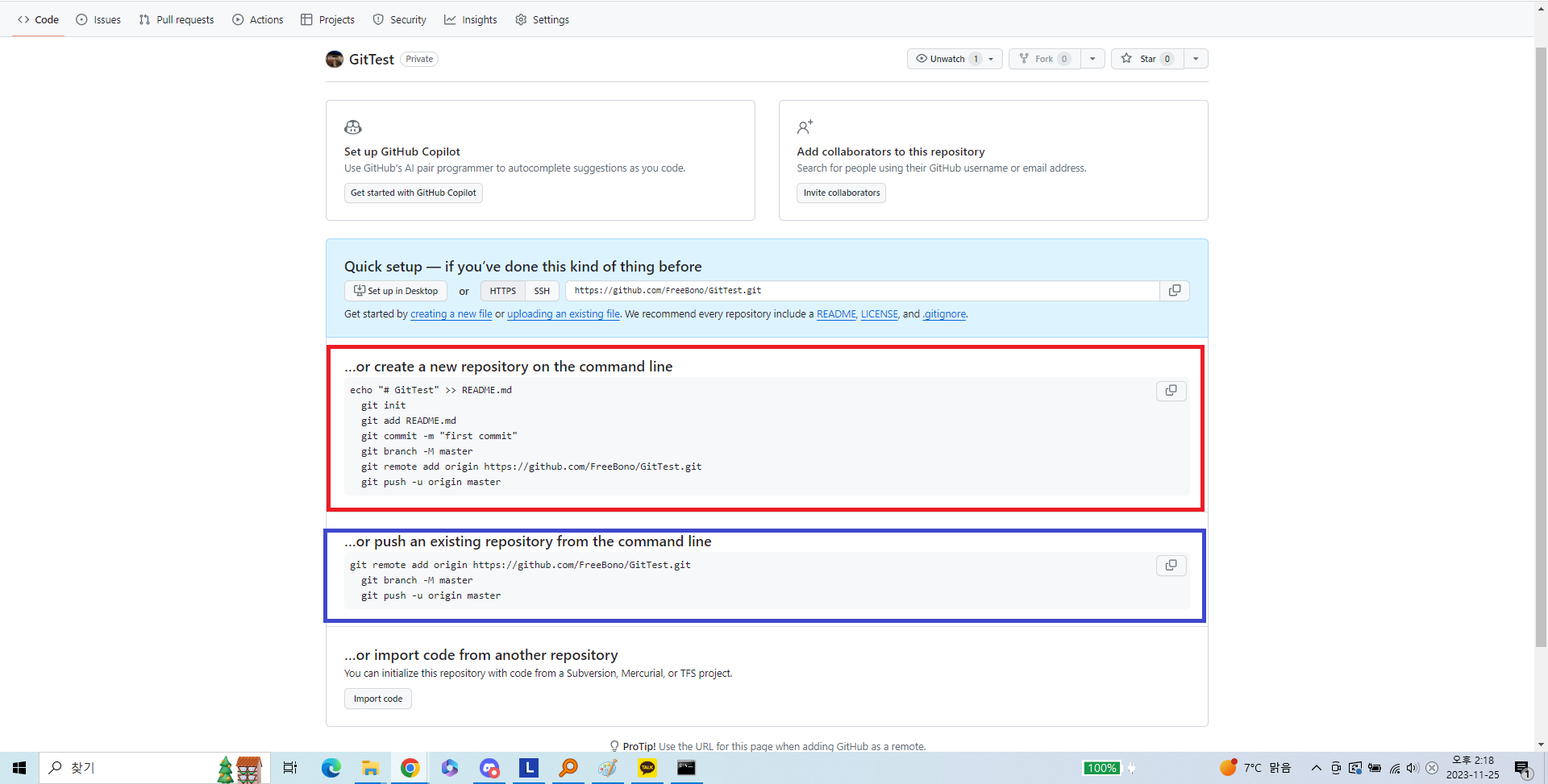 2. 기존에 있는 로컬 레포지토리를 새로 만든 원격 레포지토리와 연결하는경우 (파란색 박스)