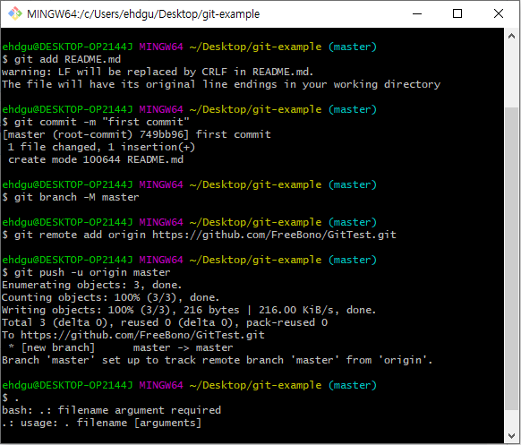 - 1번과정에서 같이 example1을 upstream 브랜치로 설정해주며 로컬 저장소의 변경내용을 gitTest_2 레포지토리에 반영될 수 있도록 한다.