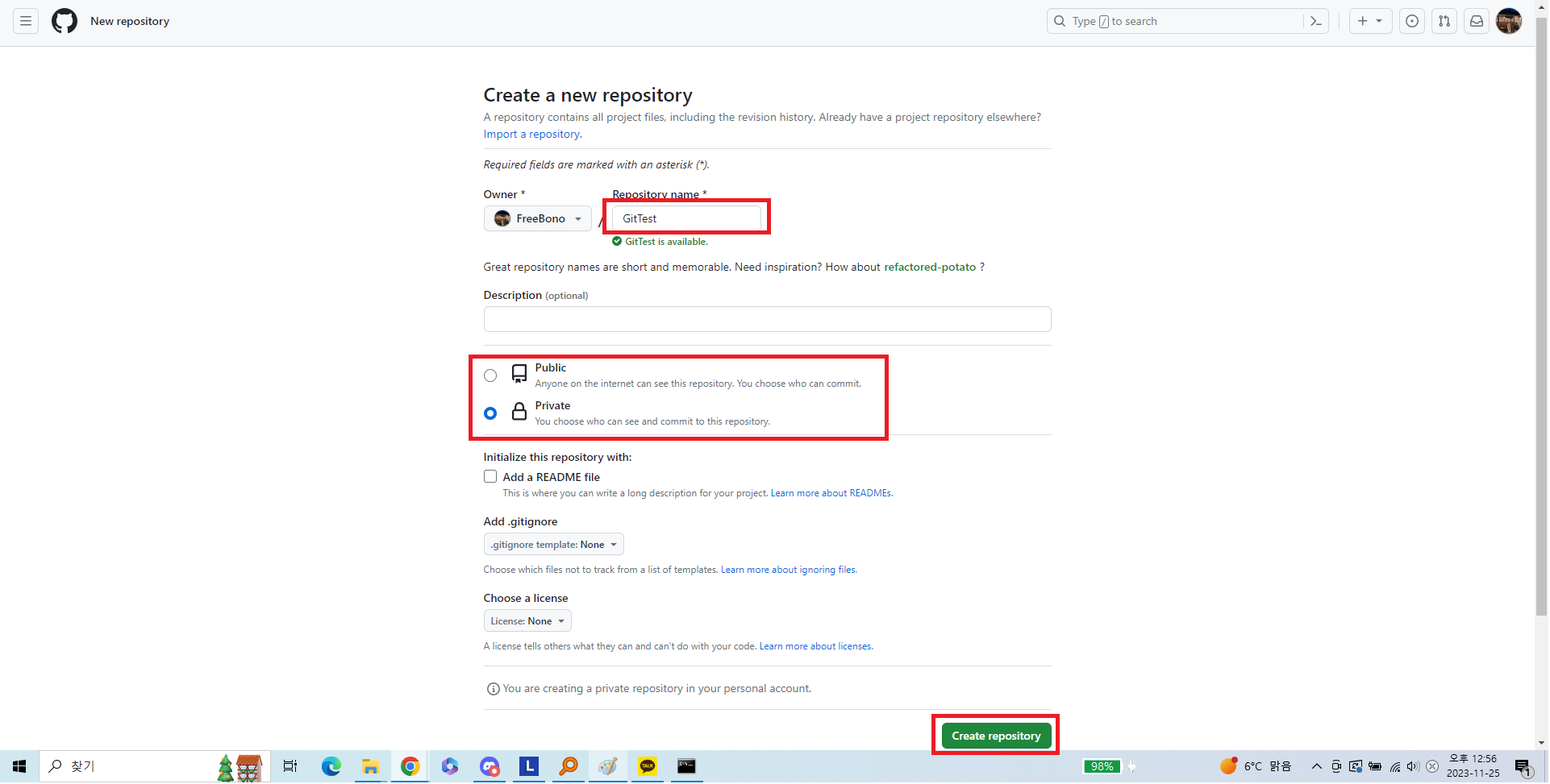 Repository name칸에 생성할 Remote Repository의 이름을 입력하고, 공개 레포지토리인지, 비공개 레포지토리인지 체크해준 뒤, Create repository 버튼을 클릭하여 레포지토리를 생성한다.