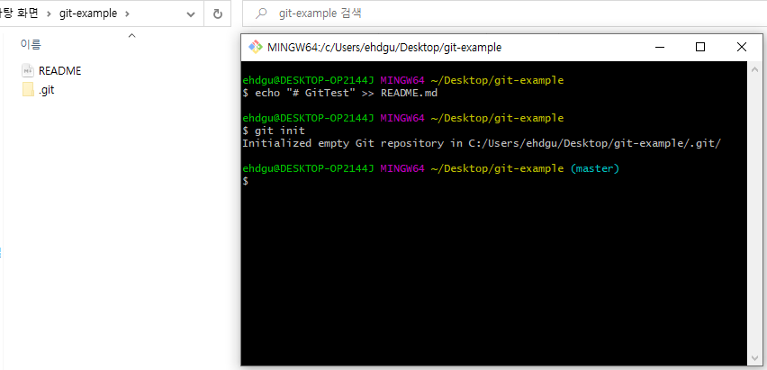 - 폴더를 깃으로 관리되는 로컬 레포지토리로 초기화한다. 명령어를 입력하면 숨긴 폴더로 .git 폴더가 생긴것을 확인할 수 있다. 해당 폴더가 생성되면, git으로 관리되는 폴더라는 것을 알 수 있다.