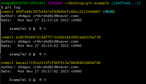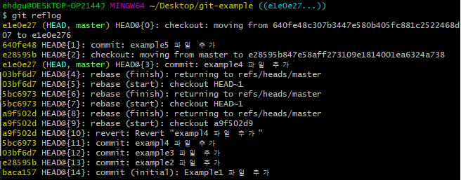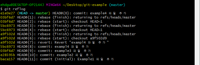이렇게 git log로 확인했을 때, example5.md에 대한 커밋인 640fe48c 커밋이 흔적도 없이 사라진 반면 git reflog에서는 모든 commit을 찾을 수 있다.