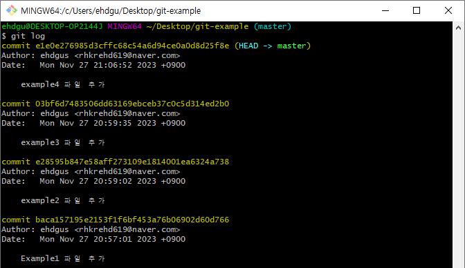 실습을 위해 example1.md, example2.md, example3.md, example4.md 를 하나씩 생성하고, 커밋을 해주었다.