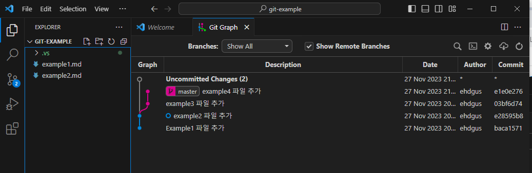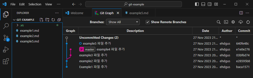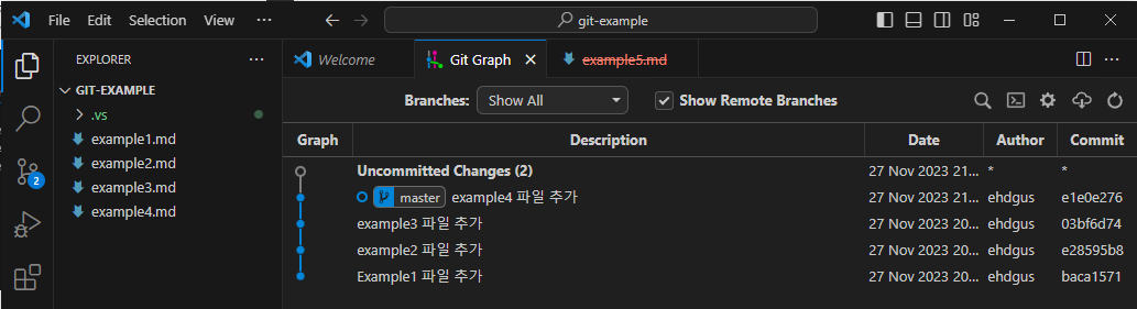 VS code로 확인해보면 현재 HEAD가 e28595b8를 가리키고 파일 목록에도 e28595b8 시점에서는 작성되지 않았던example3.md, example4.md 파일이 사라져 있는 것을 볼 수 있다.