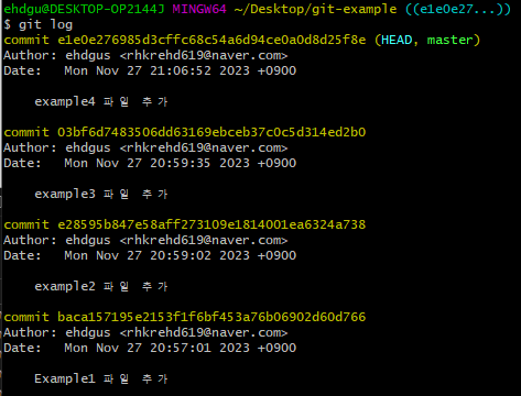 이렇게 단 3개의 커밋내역만 확인할 수가 있다. example3 추가 커밋과 example4 추가 커밋을 확인할 수가 없는 것이다. 마찬가지로 다시 example4 파일 추가 커밋인 'e1e0e276'으로 돌아가 보면