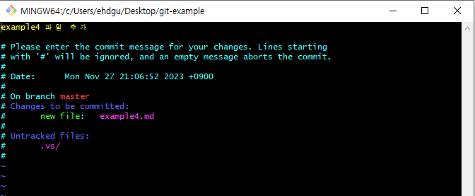여기서 마지막으로 커밋한 `example4 파일 추가` 라는 커밋 메세지에서 `example4 파일 개발 완료`로 수정이 필요하다고 가정한다면, bash 창에서