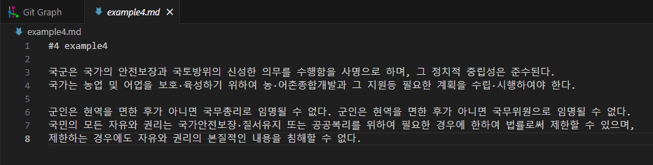 위 이미지는 exampl4.md의 파일 내용이다. 커밋을 했을 당시에는 파일 작성을 잘 완료했다고 생각했었는데, 일부 빠진 내용이 있었다고 가정하자. 새로 추가할 내용을 커밋하려면 사실
