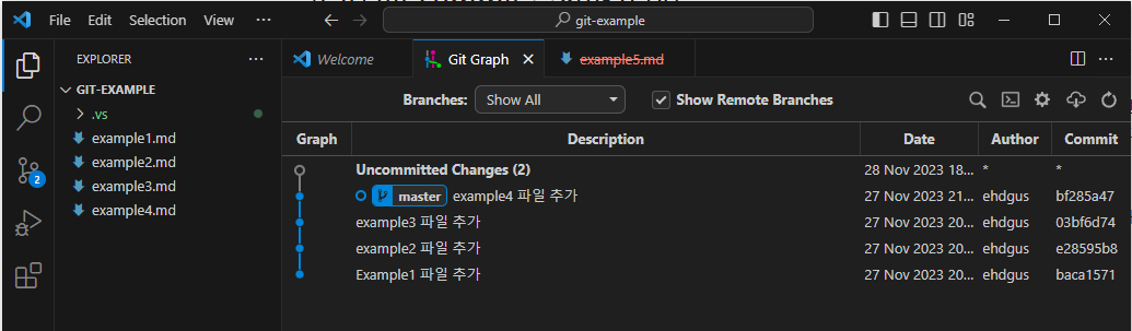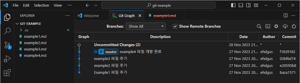 여기서 마지막으로 커밋한 `example4 파일 추가` 라는 커밋 메세지에서 `example4 파일 개발 완료`로 수정이 필요하다고 가정한다면, bash 창에서