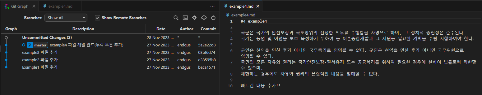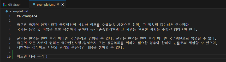 위 이미지는 exampl4.md의 파일 내용이다. 커밋을 했을 당시에는 파일 작성을 잘 완료했다고 생각했었는데, 일부 빠진 내용이 있었다고 가정하자. 새로 추가할 내용을 커밋하려면 사실