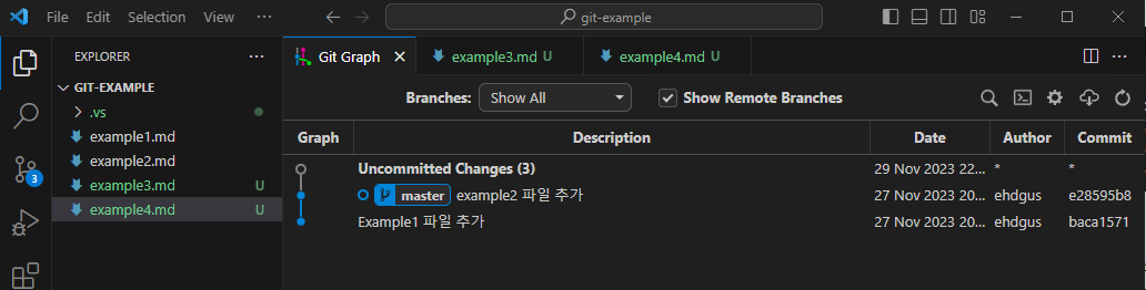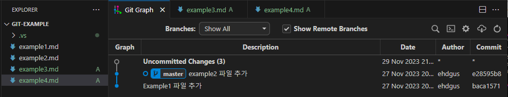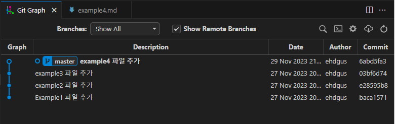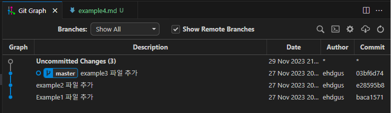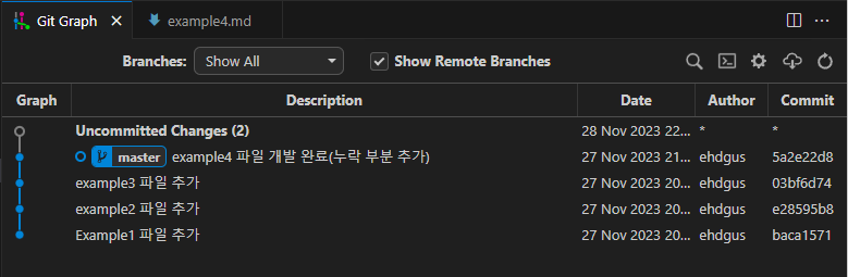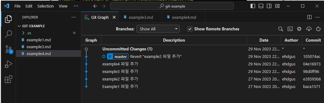 결과 화면을 보면 5 번째 커밋으로 revert커밋이 생긴 것을 알 수 있다. 또, 두 번째 커밋에서 추가했었던 example2.md파일이 Working Directory에서 사라진 것을 확인할 수 있다.