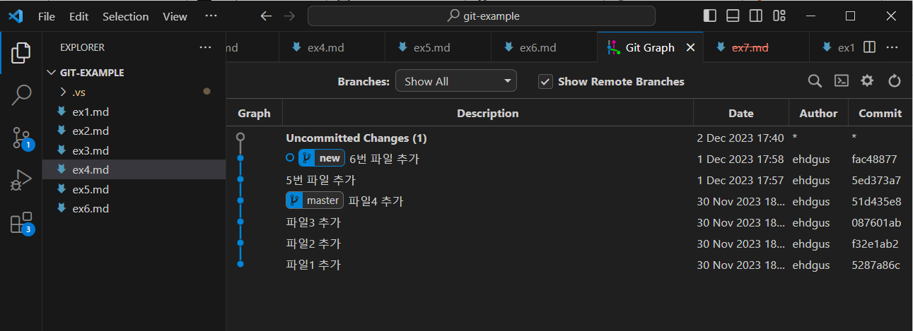 이렇게 master 브랜치와 같은 위치에 hotfix브랜치가 생성된 것을 볼수 있다. 여기서 ex4.md파일에 문제가 있어 수정이 필요하다고 가정하겠다. 우선 ex4.md파일의 내용을 수정하고 다시 커밋을 해준다.