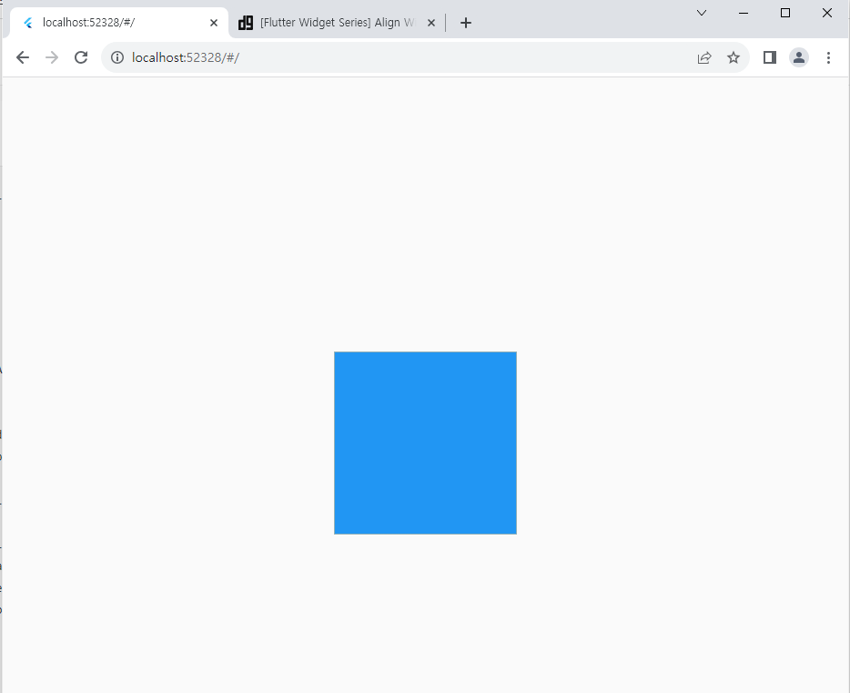 분명 200x200 크기의 오렌지색 컨테이너에 50x50 크기의 파란색 컨테이너를 넣었음에도 불구하고, 파란색 컨테이너가 오렌지색 컨테이너를 덮어버리는 현상이 발생했다. 이것은 자식 컨테이너의 위치가 지정되지 않아 부모요소 만큼 사이즈가 커진 상황으로, 이런 경우에도 Align 위젯을 사용할 수 있다.