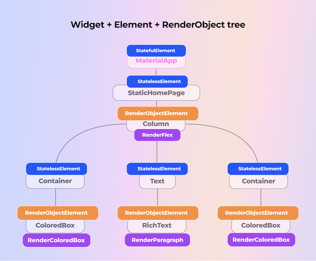 플러터로 앱을 개발하는 동안 아무리 많은 widget tree를 만들더라도 결국 RenderObjectWidgets로 귀결된다는 점을 이해하는 것이 중요하다.