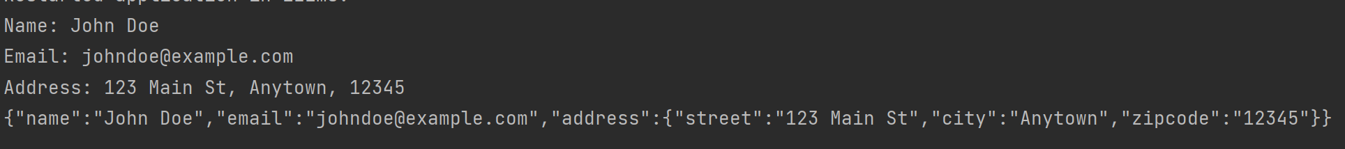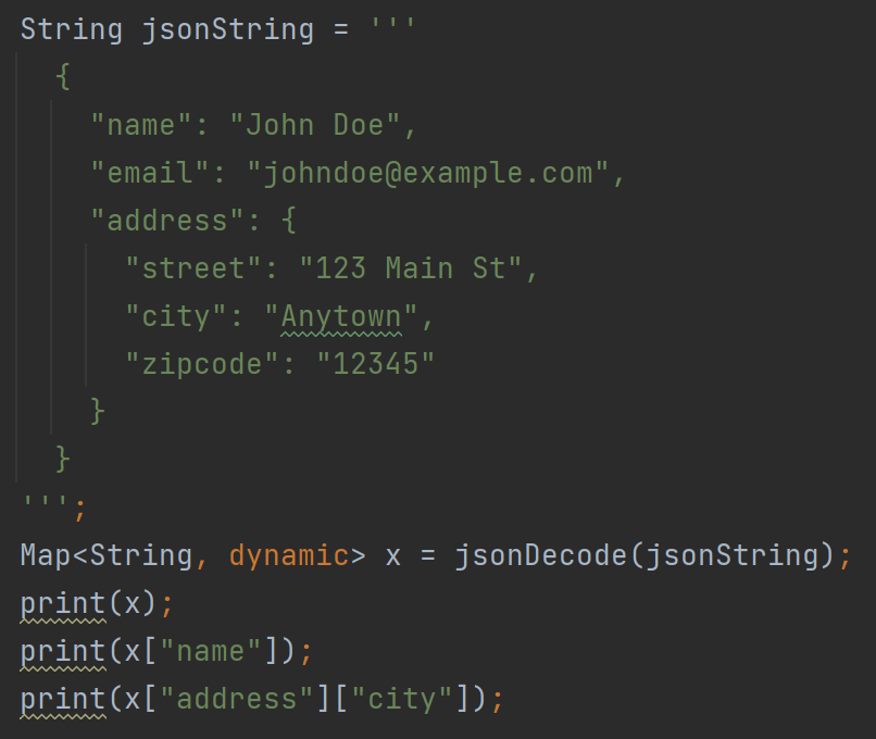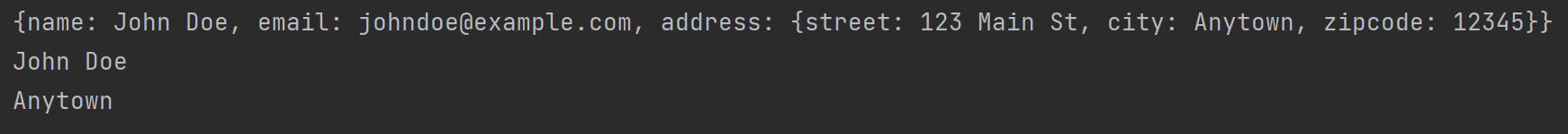 print('Address: ${address.street}, ${address.city}, ${address.zipcode}');