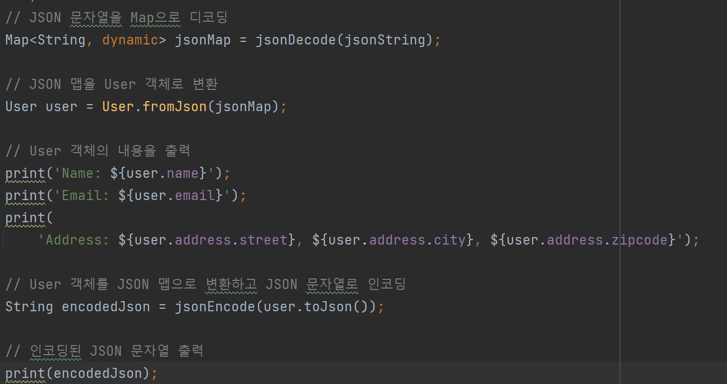 리스트로 바뀌면서 발생한 차이는 json["addresses"]라는 리스트의 map함수를 활용해 각각의 요소들을 모두 fromJosn 혹은 toJson으로 형변화를 시킨뒤, 그 집합을 리스트로 만들어준다는 것이다. 만약 이 과정을 거치지 않고 단순히 toList를 만들어준다면 타입 캐스팅이 실패하여 에러가 발생하게 될 것이다.