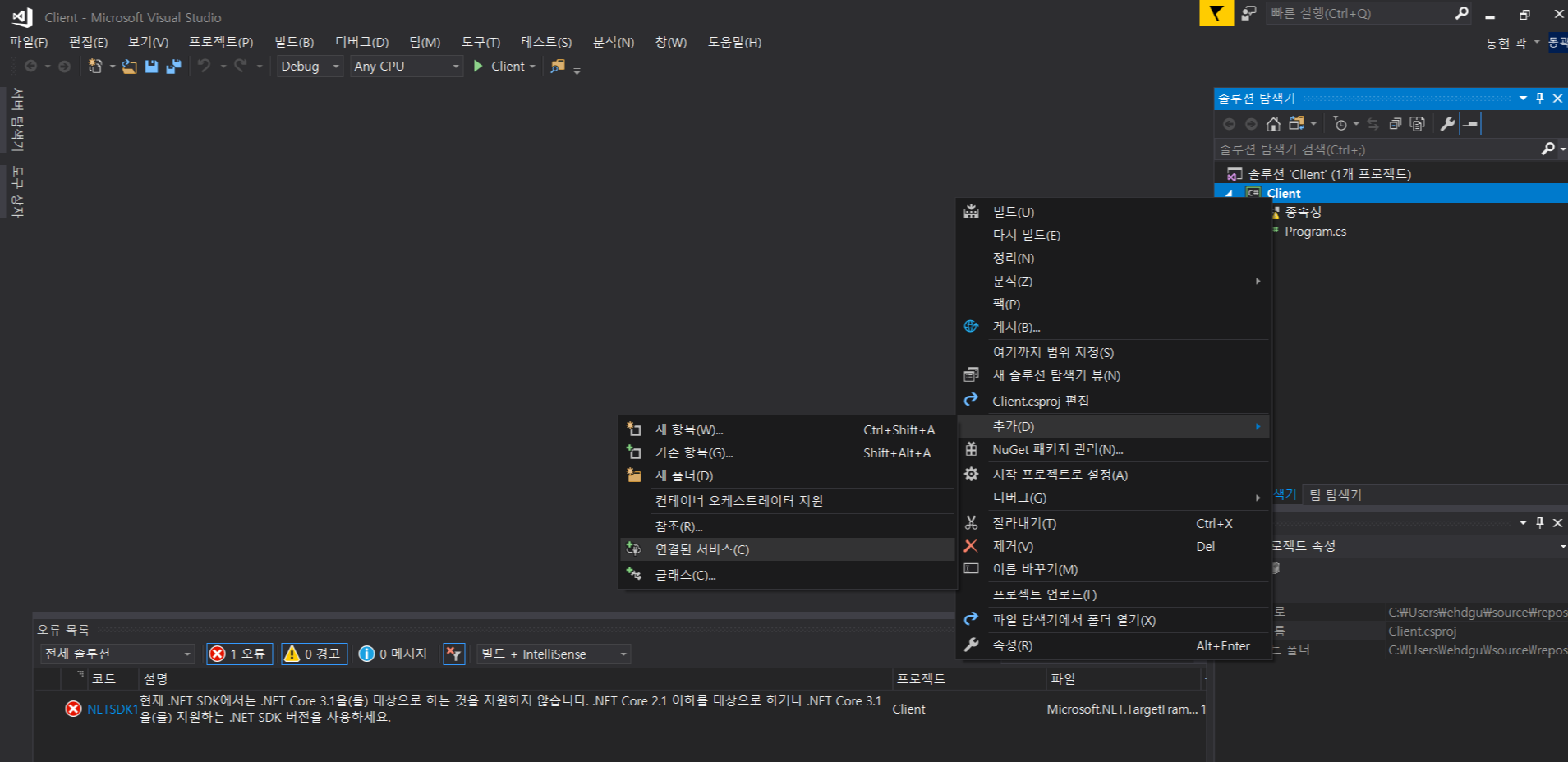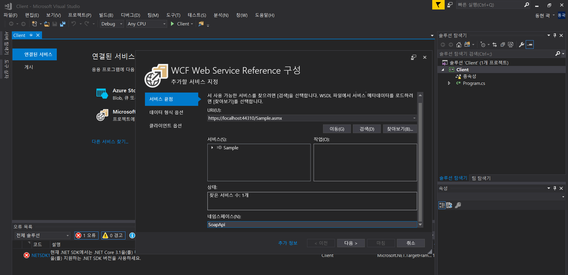 이후 콘솔 프로젝트(클라이언트) 에서 SOAP 서비스를 연결한다
