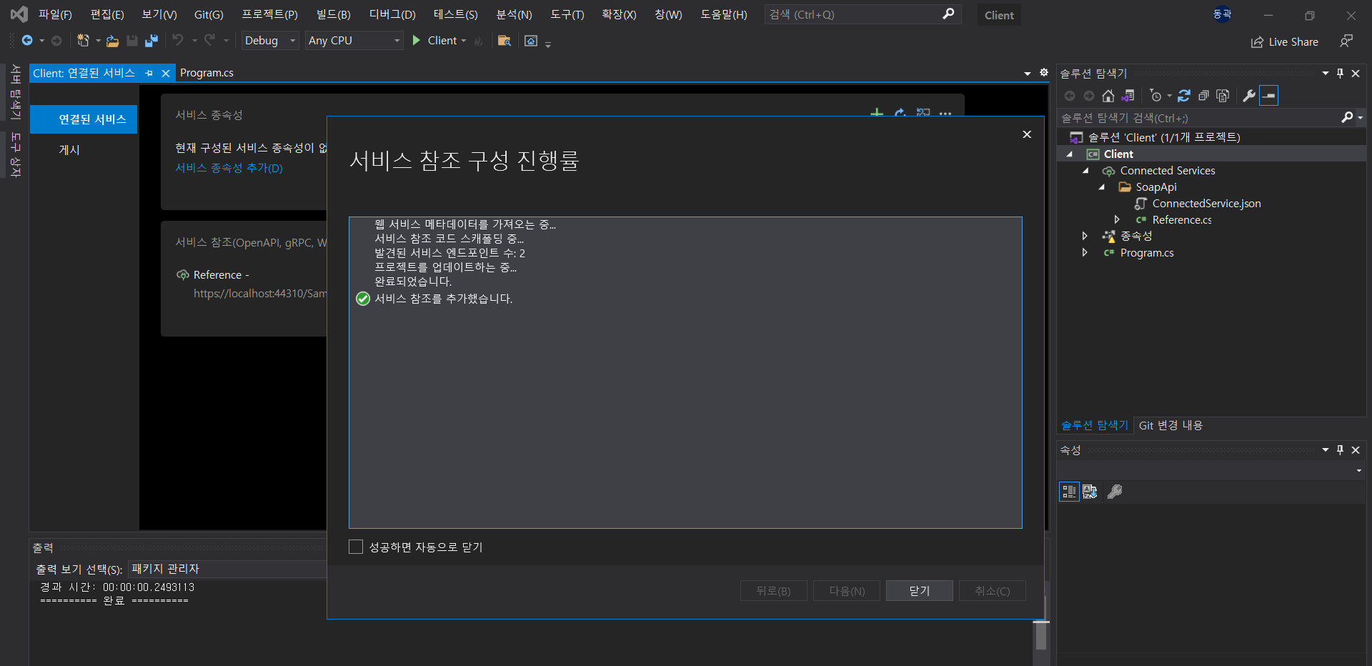 '서비스 참조를 추가했습니다'라는 문구가 보이면 정상적으로 서버가 연결된 것이다. 또한, 우측에 SoapApi가 생긴것이 보인다.