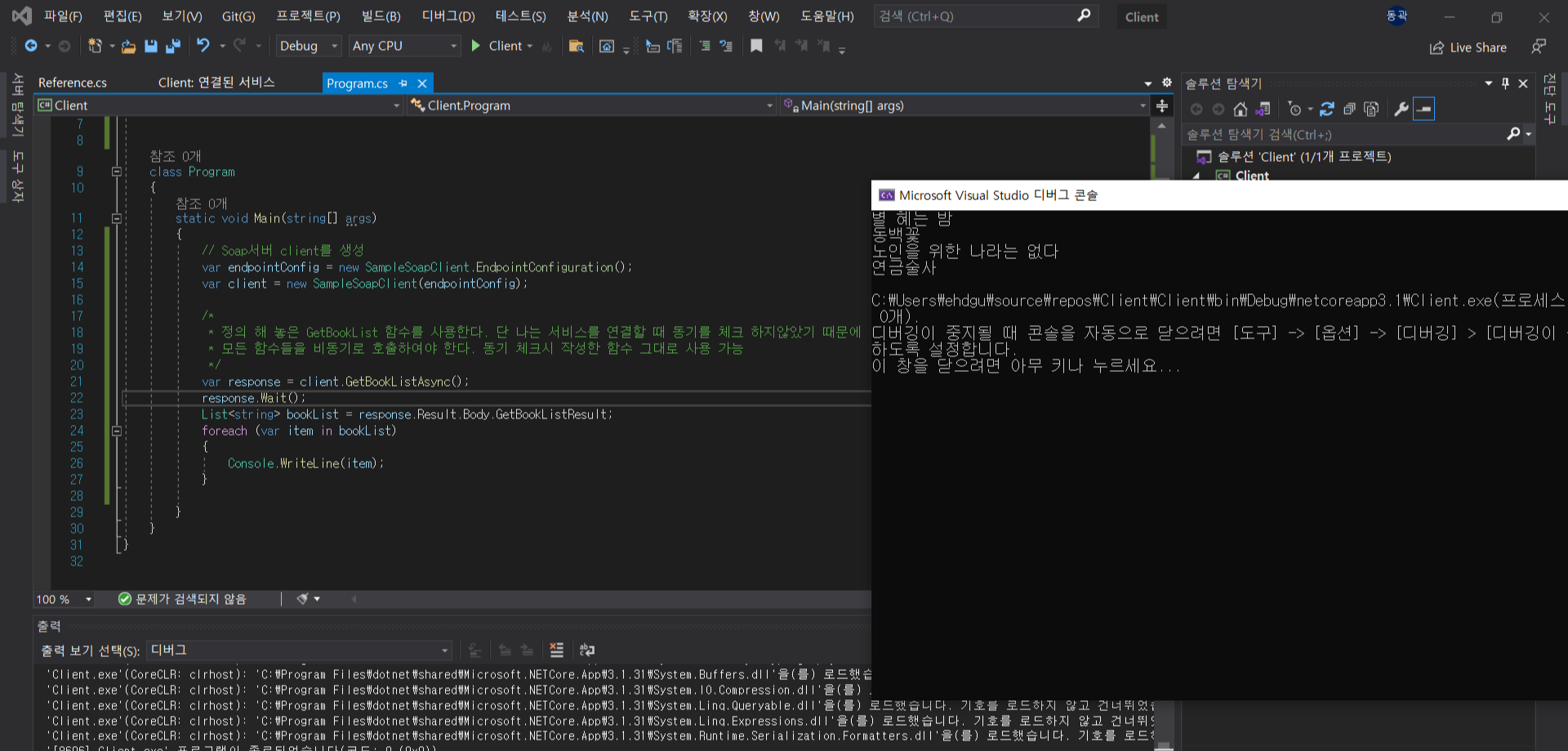 '서비스 참조를 추가했습니다'라는 문구가 보이면 정상적으로 서버가 연결된 것이다. 또한, 우측에 SoapApi가 생긴것이 보인다.