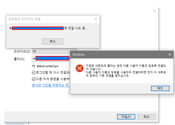 위 연결을 끊어주기 위해 net use * /delete를 실행한 뒤, 다시 네트워크 드라이브 연결을 하니 문제없이 네트워크 드라이브가 연결 되었다.