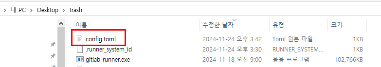 여기까지 입력을 해주면 정상적으로 runner를 등록한 것을 확인할 수 있고, 폴더에 config.toml파일이 생성된 것을 볼 수 있다.